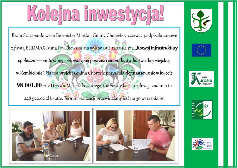 Beata Szczepankowska Burmistrz Miasta i Gminy Chorzele 7 czerwca podpisała umowę z firmą BUDMAX Anna Pawlikowska na wykonanie zadania pn. „Rozwój infrastruktury społeczno—kulturalnej i rekreacyjnej poprzez remont budynku świetlicy wiejskiej w Rembielinie”.