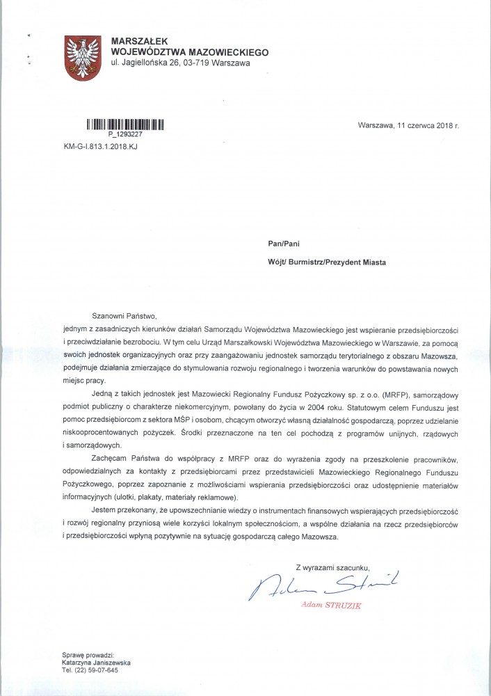 List Marszałka Województwa Mazowieckiego Adama Struzika dotyczący udzielania niskoprocentowych pożyczek przez Mazowiecki Regionalny Fundusz Pożyczkowy przedsiębiorcom z sektora MŚP i osobom chcącym otworzyć własną działalność gospodarczą.