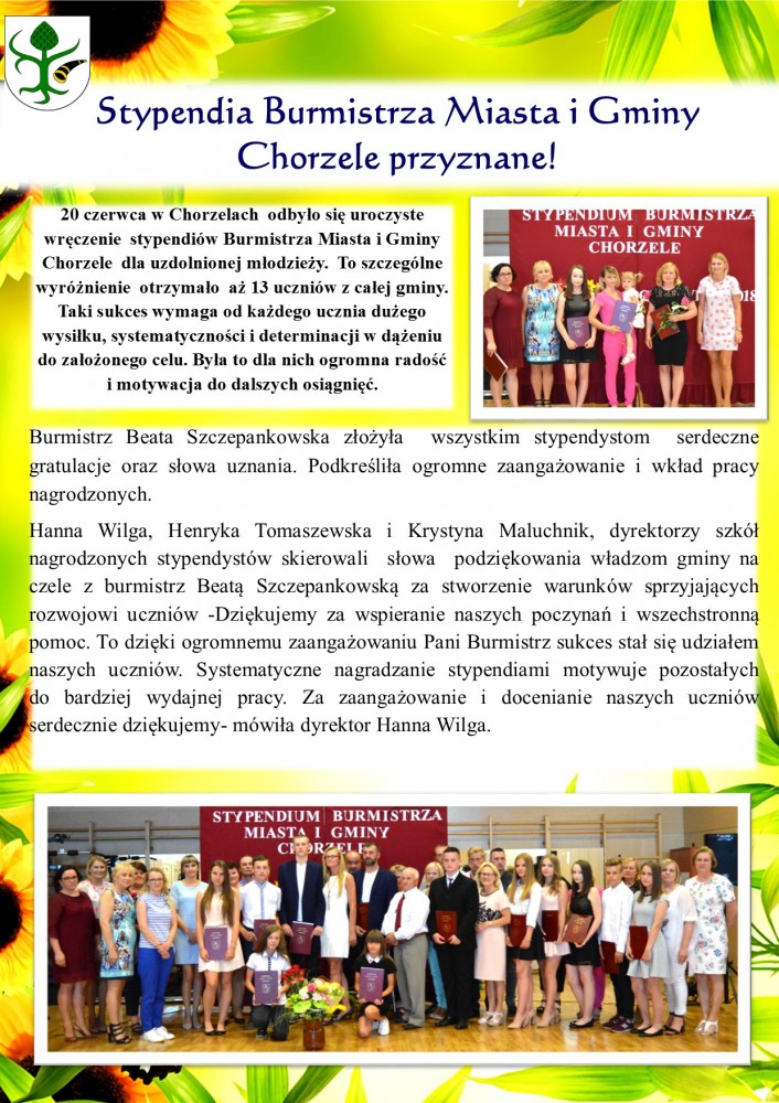 20 czerwca w Chorzelach odbyło się uroczyste wręczenie stypendiów Burmistrza Miasta i Gminy Chorzele dla uzdolnionej młodzieży. To szczególne wyróżnienie otrzymało aż 13 uczniów z całej gminy. Taki sukces wymaga od każdego ucznia dużego wysiłku, systematyczności i determinacji w dążeniu do założonego celu. Była to dla nich ogromna radość i motywacja do dalszych osiągnięć.