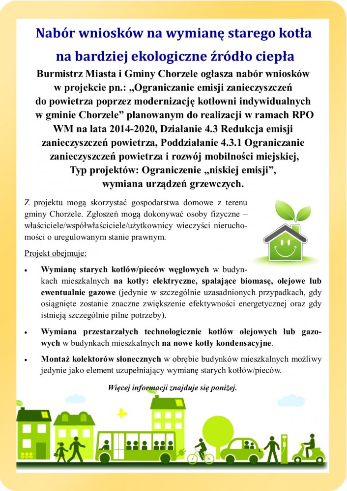 Burmistrz Miasta i Gminy Chorzele ogłasza nabór wniosków w projekcie pn.: „Ograniczanie emisji zanieczyszczeń do powietrza poprzez modernizację kotłowni indywidualnych w gminie Chorzele” planowanym do realizacji w ramach RPO WM na lata 2014-2020, Działanie 4.3 Redukcja emisji zanieczyszczeń powietrza, Poddziałanie 4.3.1 Ograniczanie zanieczyszczeń powietrza i rozwój mobilności miejskiej, Typ projektów: Ograniczenie „niskiej emisji”, wymiana urządzeń grzewczych.
