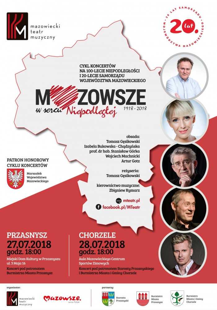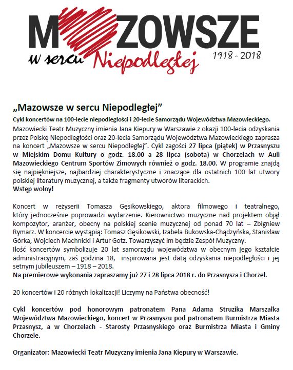 Cykl koncertów na 100-lecie niepodległości i 20-lecie Samorządu Województwa Mazowieckiego. Mazowiecki Teatr Muzyczny imienia Jana Kiepury w Warszawie z okazji 100-lecia odzyskania przez Polskę Niepodległości oraz 20-lecia Samorządu Województwa Mazowieckiego zaprasza na koncert „Mazowsze w sercu Niepodległej”. Cykl zagości 27 lipca (piątek) w Przasnyszu w Miejskim Domu Kultury o godz. 18.00 a 28 lipca (sobota) w Chorzelach w Auli Mazowieckiego Centrum Sportów Zimowych również o godz. 18.00. W programie znajdą się najpiękniejsze, najbardziej charakterystyczne i znaczące dla ostatnich 100 lat utwory polskiej literatury muzycznej, a także fragmenty utworów literackich. Wstęp wolny!