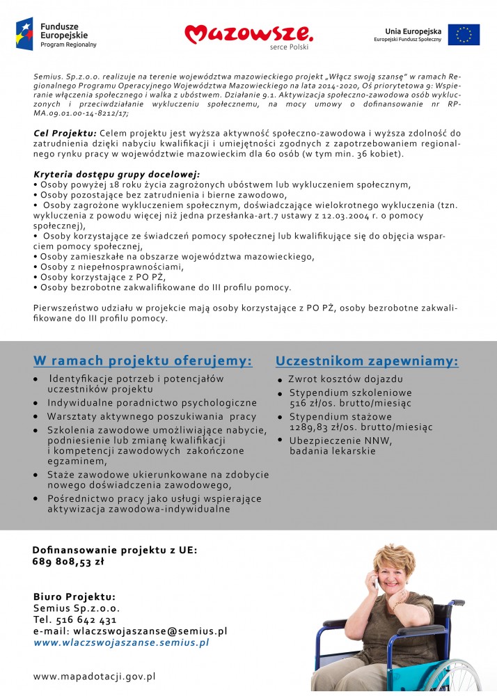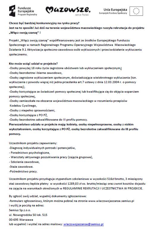 Projekt „Włącz swoją szansę” współfinansowany jest ze środków Europejskiego Funduszu Społecznego w ramach Regionalnego Programu Operacyjnego Województwa Mazowieckiego Działanie 9.1 Aktywizacja społeczno-zawodowa osób wykluczonych i przeciwdziałanie wykluczeniu społecznemu.