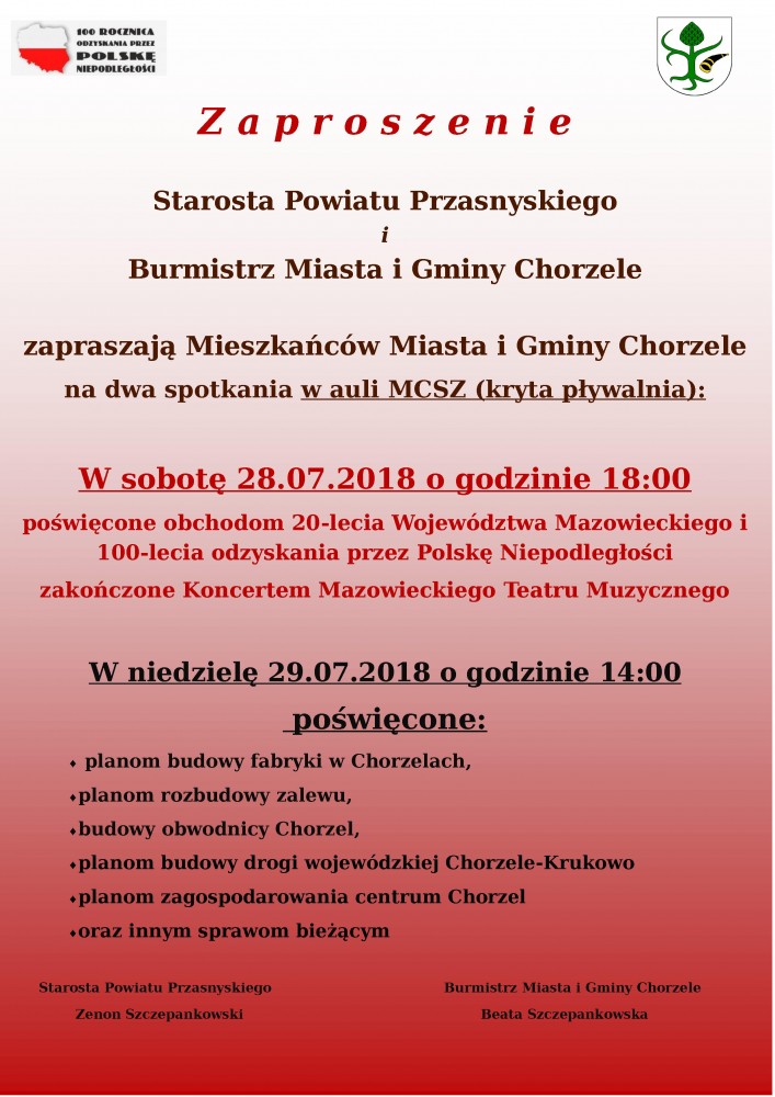 Starosta Powiatu Przasnyskiego i Burmistrz Miasta i Gminy Chorzele serdecznie zapraszają Mieszkańców Miasta i Gminy Chorzele na dwa spotkania w auli MCZS (kryta pływalnia) w sobotę 28.07.2018r. o godz. 18:00 oraz w niedzielę 29.07.2018r. o godz. 14:00. Szczegóły znajdują się na plakacie. Serdecznie zapraszamy!