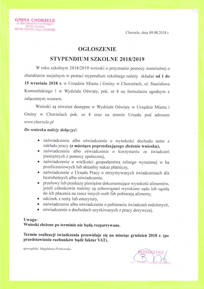 W roku szkolnym 2018/2019 wnioski o przyznanie pomocy materialnej o charakterze socjalnym w postaci stypendium szkolnego należy składać od 1 do 15 września 2018r. w Urzędzie Miasta i Gminy w Chorzelach, ul. Stanisława Komosińskiego 1 w Wydziale Oświaty, pok. nr 8.