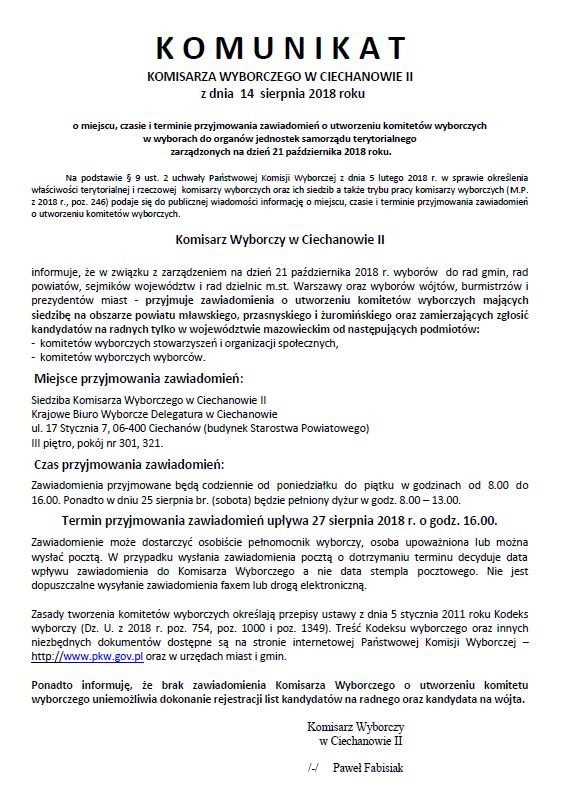 Komunikat Komisarza Wyborczego w Ciechanowie II z dnia 14 sierpnia 2018 roku o miejscu, czasie i terminie przyjmowania zawiadomień o utworzeniu komitetów wyborczych w wyborach do organów jednostek samorządu terytorialnego zarządzonych na dzień 21 października 2018 roku.