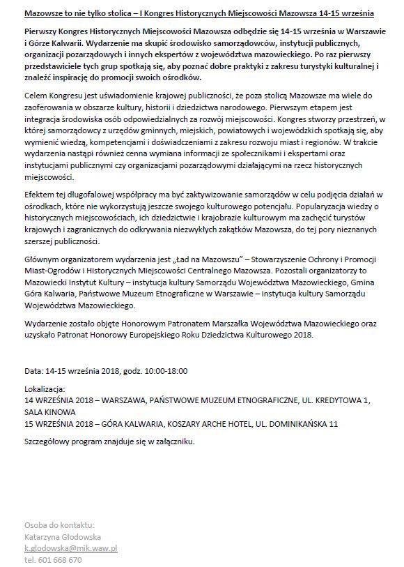 Mazowsze to nie tylko stolica – I Kongres Historycznych Miejscowości Mazowsza 14-15 września