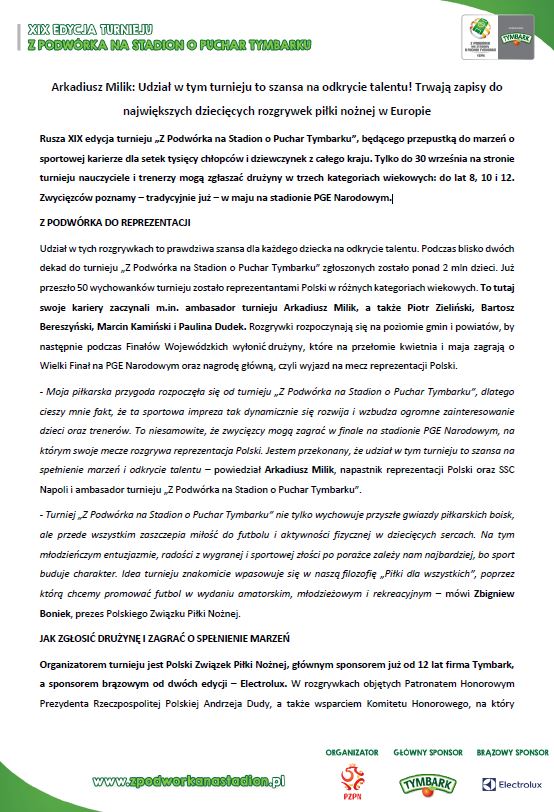Rusza XIX edycja turnieju „Z Podwórka na Stadion o Puchar Tymbarku”, będącego przepustką do marzeń o sportowej karierze dla setek tysięcy chłopców i dziewczynek z całego kraju. Tylko do 30 września na stronie turnieju nauczyciele i trenerzy mogą zgłaszać drużyny w trzech kategoriach wiekowych: do lat 8, 10 i 12. Zwycięzców poznamy – tradycyjnie już – w maju na stadionie PGE Narodowym.