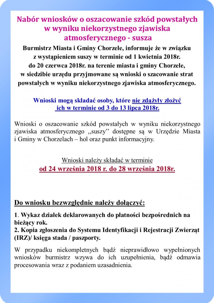 Burmistrz Miasta i Gminy Chorzele, informuje że w związku z wystąpieniem suszy w terminie od 1 kwietnia 2018r. do 20 czerwca 2018r. na terenie miasta i gminy Chorzele, w siedzibie urzędu przyjmowane są wnioski o szacowanie strat powstałych w wyniku niekorzystnego zjawiska atmosferycznego.