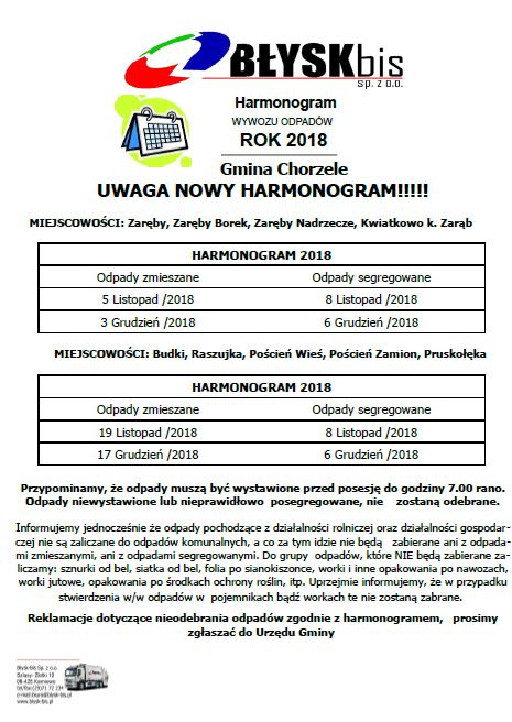 Nastąpiła zmiana harmonogramu wywozu odpadów na rok 2018 (listopad oraz grudzień) w następujących miejscowościach: Zaręby, Zaręby Borek, Zaręby Nadrzecze, Kwiatkowo k. Zarąb, Budki, Raszujka, Poścień Wieś, Poścień Zamion, Pruskołęka. Prosimy o zapoznanie się z nowym harmonogramem.
