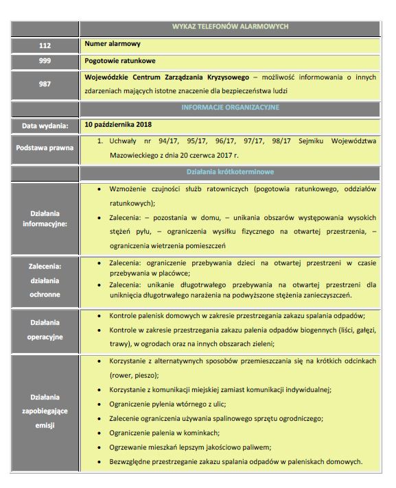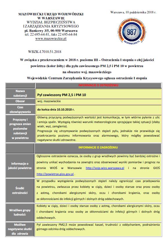 W związku z przekroczeniem w 2018 r. poziomu III – Ostrzeżenia I stopnia o złej jakości powietrza (kolor żółty) dla pyłu zawieszonego PM 2,5 i PM 10 w powietrzu na obszarze woj. mazowieckiego Wojewódzkie Centrum Zarządzania Kryzysowego ogłasza ostrzeżenie I stopnia.