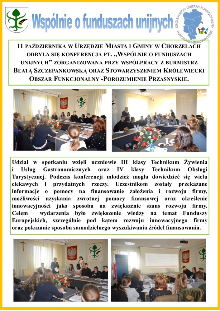 11 października w Urzędzie Miasta i Gminy w Chorzelach odbyła się konferencja pt. "Wspólnie o funduszach unijnych" zorganizowana przy współpracy z Burmistrz Beatą Szczepankowską oraz Stowarzyszeniem Królewiecki Obszar Funkcjonalny - Porozumienie Przasnyskie.