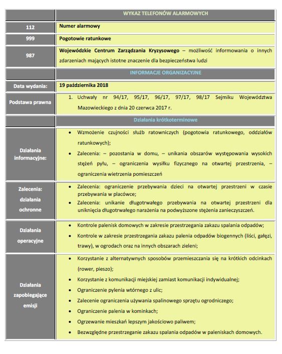W związku z przekroczeniem w 2018 r. poziomu III – Ostrzeżenia I stopnia o złej jakości powietrza (kolor żółty) dla pyłu zawieszonego PM 2,5 w powietrzu na obszarze woj. mazowieckiego Wojewódzkie Centrum Zarządzania Kryzysowego ogłasza ostrzeżenie I stopnia.