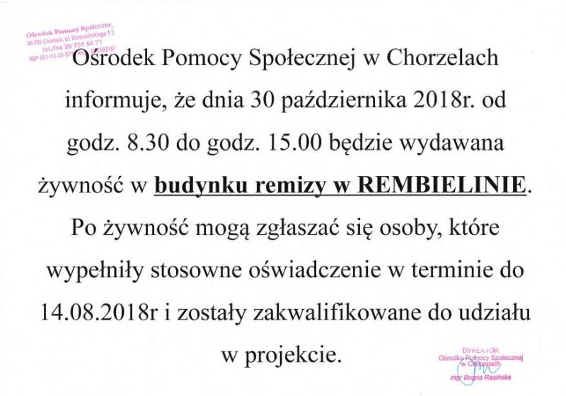 Ośrodek Pomocy Społecznej w Chorzelach informuje, że dnia 30 paźdzlernika 2018r. od godz.8.30 do godz. 15.00 będzie wydawana żywność w budynku remizy w REMBIELINIE. Po żywność mogą zgłaszać się osoby, które wypełnią stosowne oświadczenie w terminie do 14.08.2018r i zostały zakwalifikowane do udziału w projekcie.