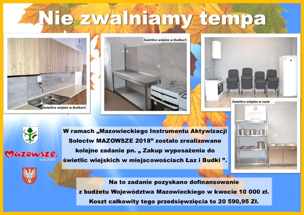 W ramach "Mazowieckiego Instrumentu Aktywizacji Sołectw MAZOWSZE 2018" zostało zrealizowane kolejne zadanie pn. "Zakup wyposażenia do świetlic wiejskich w miejscowościach Łaz i Budki".