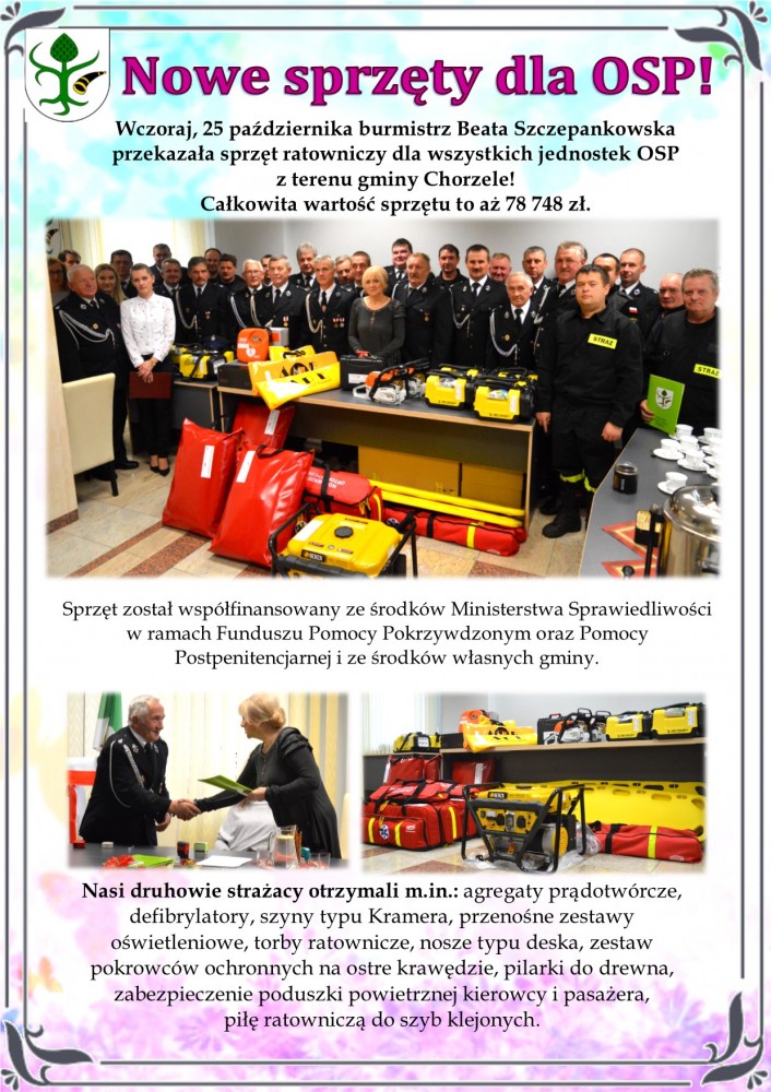 Wczoraj, 25 października burmistrz Beata Szczepankowska przekazała sprzęt ratowniczy dla wszystkich jednostek OSP z terenu gminy Chorzele! Całkowita wartość sprzętu to aż 78 748 zł.