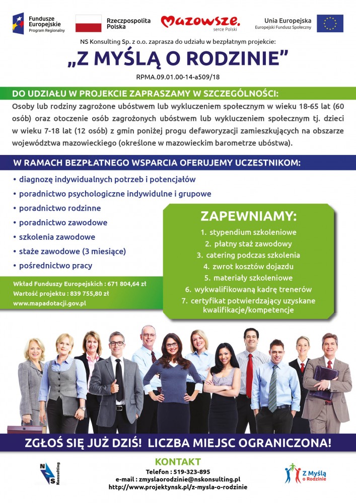 Projekt „ Z myślą o rodzinie” skierowany jest do osób lub rodzin zagrożonych ubóstwem lub wykluczeniem społecznym w wieku 18-65 lat oraz ich otoczenia tj. dzieci w wieku 7-18 lat z gmin poniżej progu defaworyzacji (określonych w mazowieckim barometrze ubóstwa).