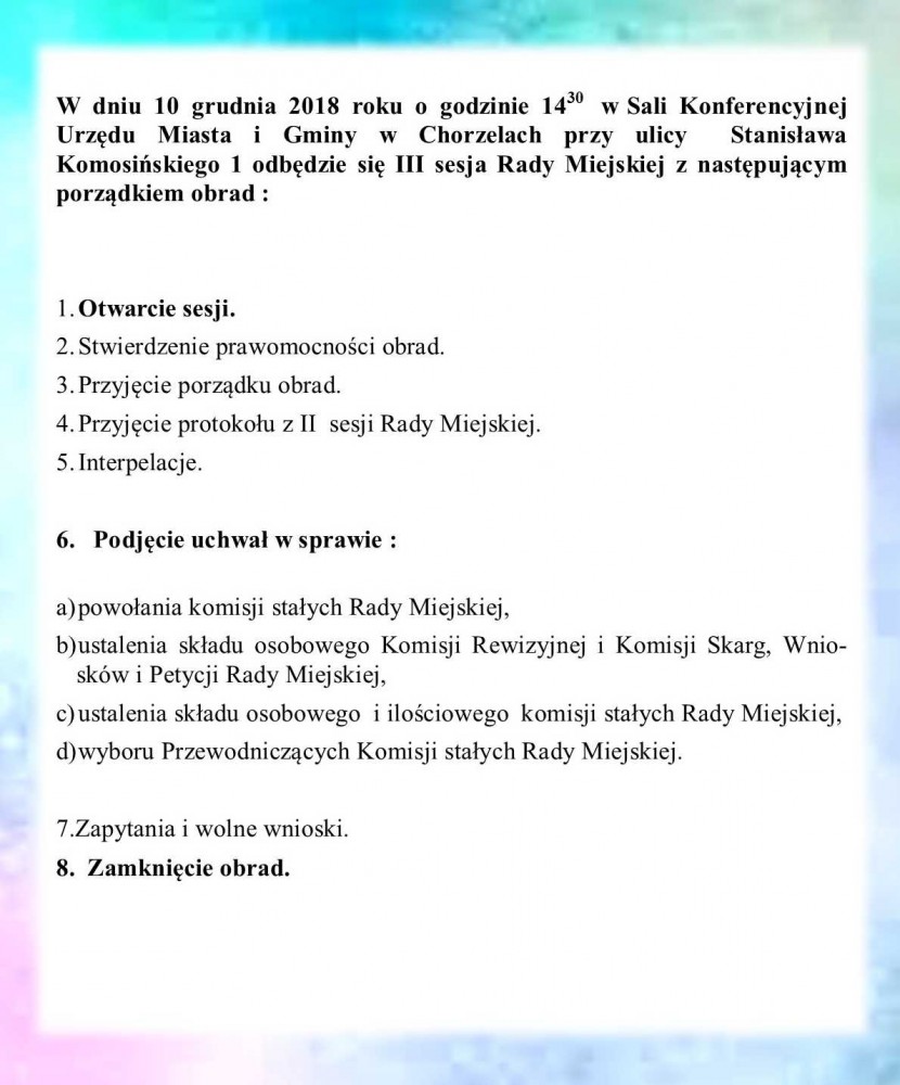 W dniu 10 grudnia 2018 roku o godzinie 1430 w Sali Konferencyjnej Urzędu Miasta i Gminy w Chorzelach przy ulicy Stanisława Komosińskiego 1 odbędzie się III sesja Rady Miejskiej.