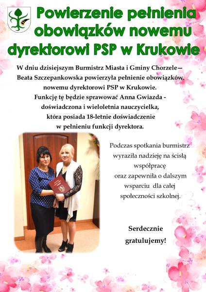 W dniu dzisiejszym Burmistrz Miasta i Gminy Chorzele—Beata Szczepankowska powierzyła pełnienie obowiązków nowemu dyrektorowi PSP w Krukowie. Funkcję tę będzie sprawować Anna Gwiazda - doświadczona i wieloletnia nauczycielka, która posiada 18-letnie doświadczenie w pełnieniu funkcji dyrektora.