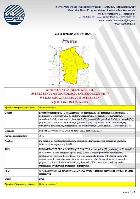 Ostrzeżenie meteorologiczne zbiorczo nr 77 Instytutu Meteorologii i Gospodarki Wodnej - PIB Centralne Biuro Prognoz Meteorologicznych w Warszawie.