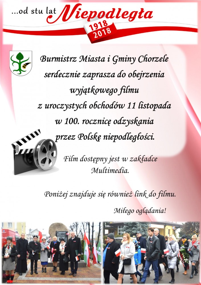 Burmistrz Miasta i Gminy Chorzele serdecznie zaprasza do obejrzenia wyjątkowego filmu z uroczystych obchodów 11 listopada w 100. rocznicę odzyskania przez Polskę niepodległości.