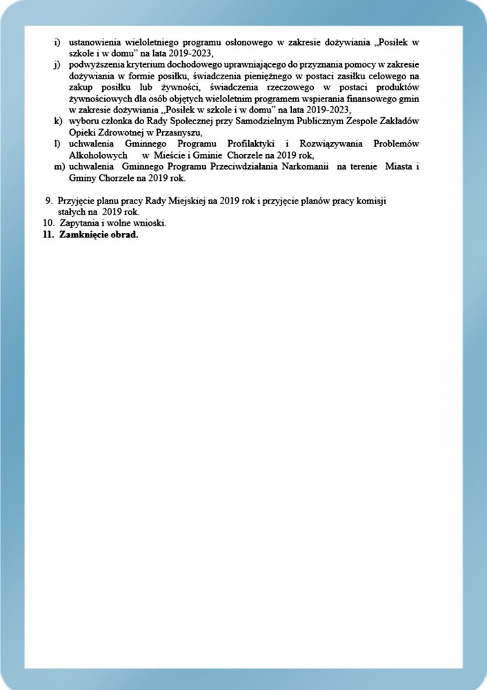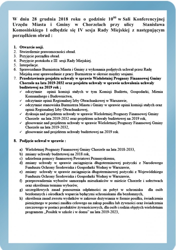 W dniu 28 grudnia 2018 roku o godzinie 1000 w Sali Konferencyjnej Urzędu Miasta i Gminy w Chorzelach przy ulicy Stanisława Komosińskiego 1 odbędzie się IV sesja Rady Miejskiej z następującym porządkiem obrad :