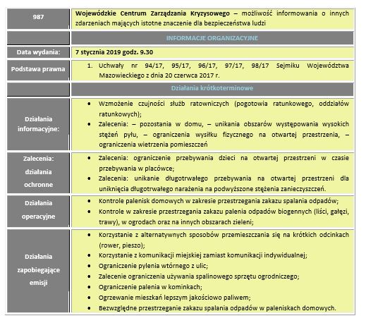 W związku z przekroczeniem w 2019 r. poziomu III – Ostrzeżenia I stopnia o złej jakości powietrza (kolor żółty) dla pyłu zawieszonego PM 2,5 w powietrzu na obszarze woj. mazowieckiego Wojewódzkie Centrum Zarządzania Kryzysowego ogłasza ostrzeżenie I stopnia.