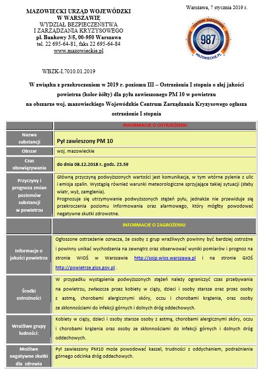 W związku z przekroczeniem w 2019 r. poziomu III – Ostrzeżenia I stopnia o złej jakości powietrza (kolor żółty) dla pyłu zawieszonego PM 10 w powietrzu na obszarze woj. mazowieckiego Wojewódzkie Centrum Zarządzania Kryzysowego ogłasza ostrzeżenie I stopnia