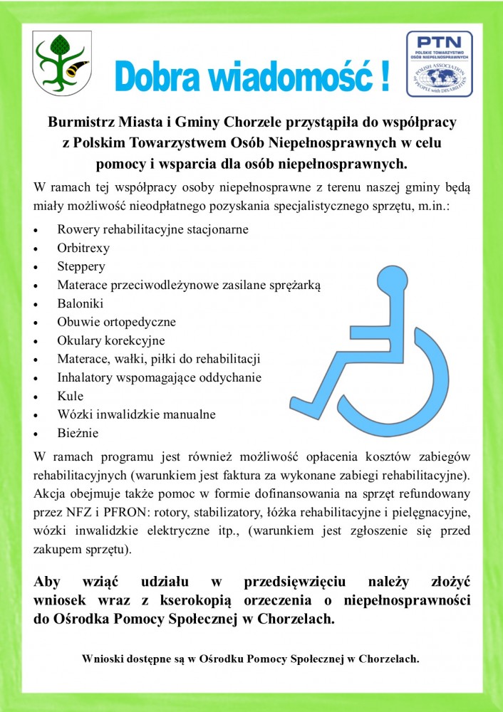 Burmistrz Miasta i Gminy Chorzele przystąpiła do współpracy z Polskim Towarzystwem Osób Niepełnosprawnych w celu pomocy i wsparcia dla osób niepełnosprawnych.