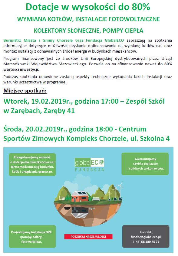 Burmistrz Miasta i Gminy Chorzele oraz Fundacja GlobalECO zapraszają na spotkania informacyjne dotyczące możliwości uzyskania dofinansowania na wymianę kotłów c.o. oraz montaż instalacji z odnawialnych źródeł energii w budynkach mieszkańców.