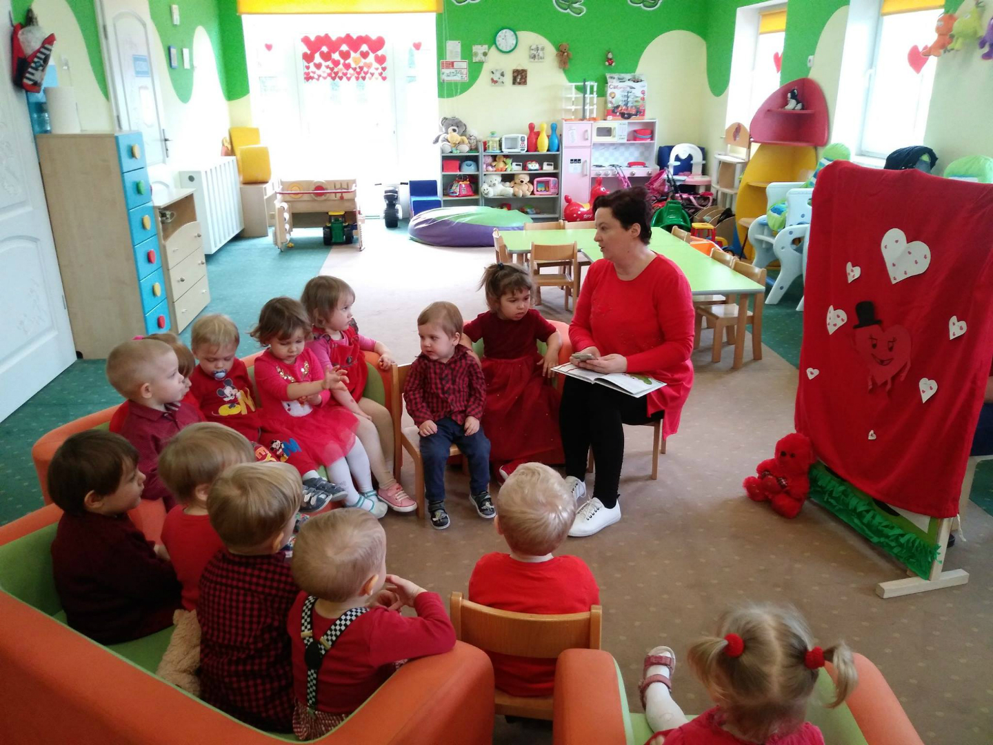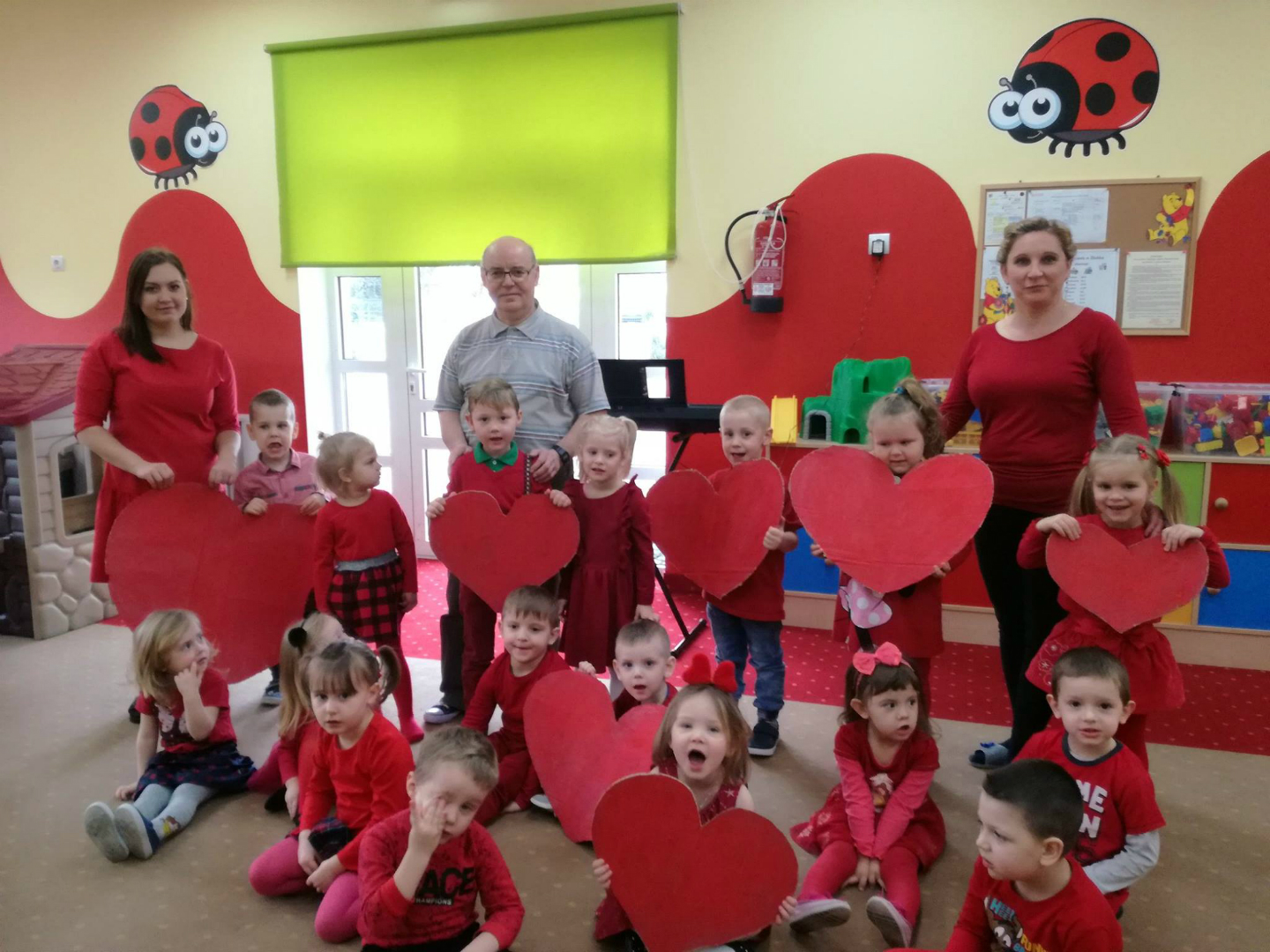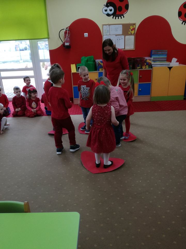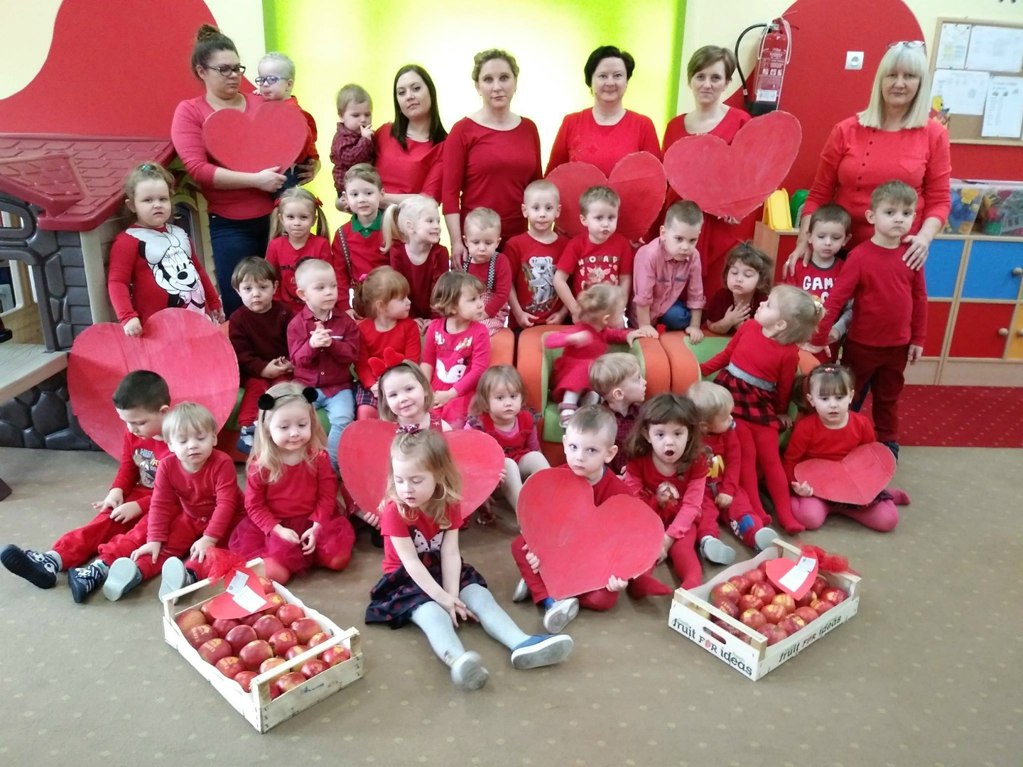 Młodsza grupa obejrzała przedstawienie pt. „Zakochana Żaba”, a następnie własnymi rączkami stworzyły odbicia serduszek dla swoich najbliższych. Dzieci z grupy „Biedronek „ brały udział w tanecznych konkursach i wesołych zabawach m.in. „Amor” – trafianie piłeczkami do serca oraz „Gorące serca” – taniec serc przy muzyce. Miłym akcentem były podarowane przez rodziców Antosia smaczne jabłuszka z walentynkowym motywem za które serdecznie dziękujemy . Na koniec wszyscy stanęliśmy do pamiątkowego zdjęcia.
