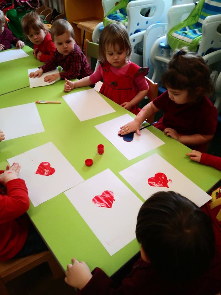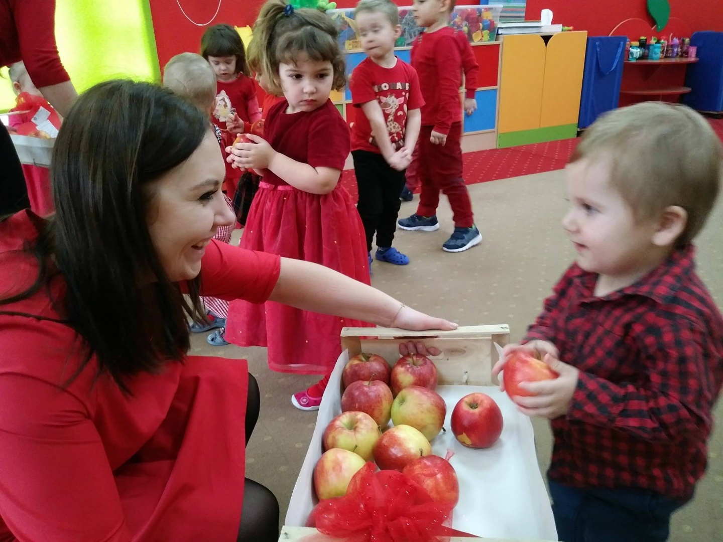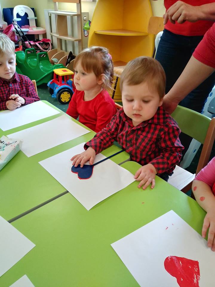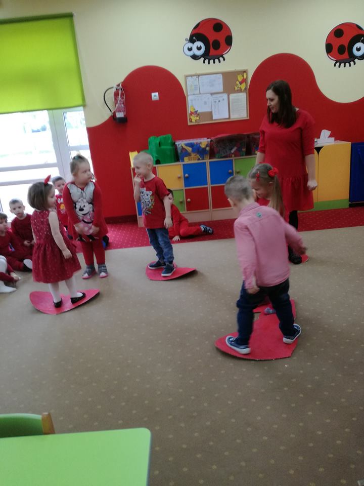 Młodsza grupa obejrzała przedstawienie pt. „Zakochana Żaba”, a następnie własnymi rączkami stworzyły odbicia serduszek dla swoich najbliższych. Dzieci z grupy „Biedronek „ brały udział w tanecznych konkursach i wesołych zabawach m.in. „Amor” – trafianie piłeczkami do serca oraz „Gorące serca” – taniec serc przy muzyce. Miłym akcentem były podarowane przez rodziców Antosia smaczne jabłuszka z walentynkowym motywem za które serdecznie dziękujemy . Na koniec wszyscy stanęliśmy do pamiątkowego zdjęcia.