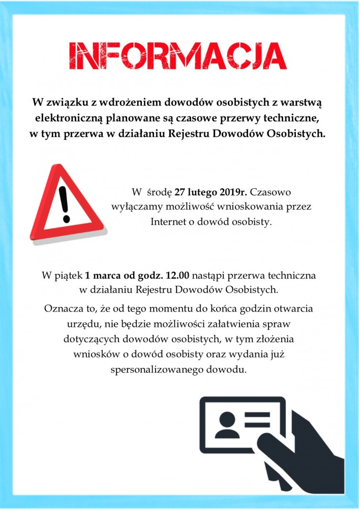 W związku z wdrożeniem dowodów osobistych z warstwą elektroniczną planowane są czasowe przerwy techniczne, w tym przerwa w działaniu Rejestru Dowodów Osobistych.