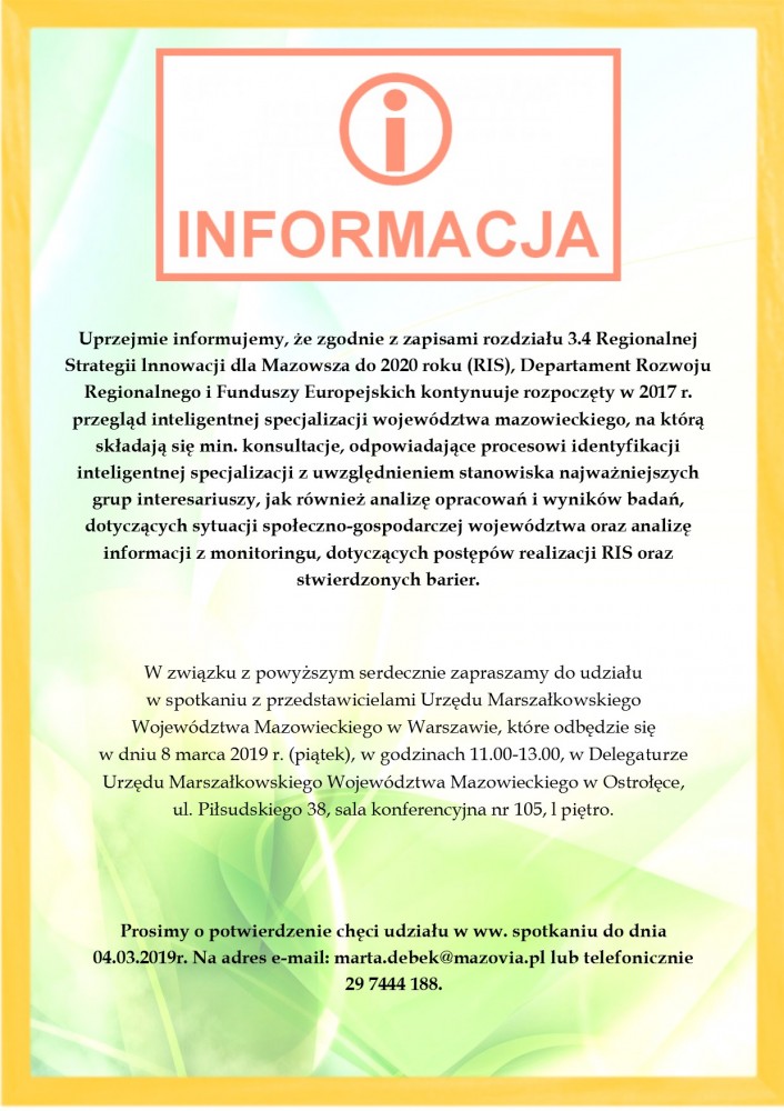 Uprzejmie informujemy, że zgodnie z zapisami rozdziału 3.4 Regionalnej Strategii lnnowacji dla Mazowsza do 2020 roku (RIS), Departament Rozwoju Regionalnego i Funduszy Europejskich kontynuuje rozpoczęty w 2017 r. przegląd inteligentnej specjalizacji województwa mazowieckiego, na którą składają się min. konsultacje, odpowiadające procesowi identyfikacji inteligentnej specjalizacji z uwzględnieniem stanowiska najważniejszych grup interesariuszy, jak również analizę opracowań i wyników badań, dotyczących sytuacji społeczno-gospodarczej województwa oraz analizę informacji z monitoringu, dotyczących postępów realizacji RIS oraz stwierdzonych barier.