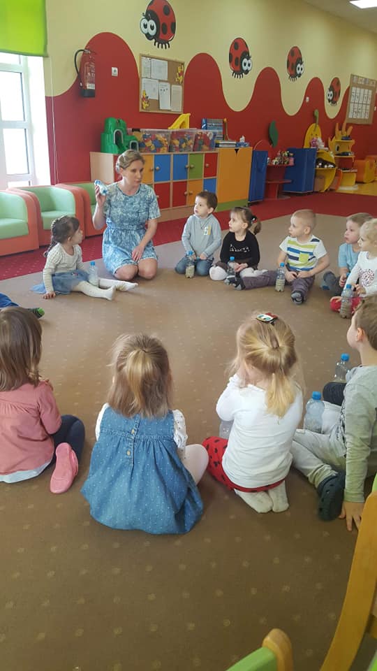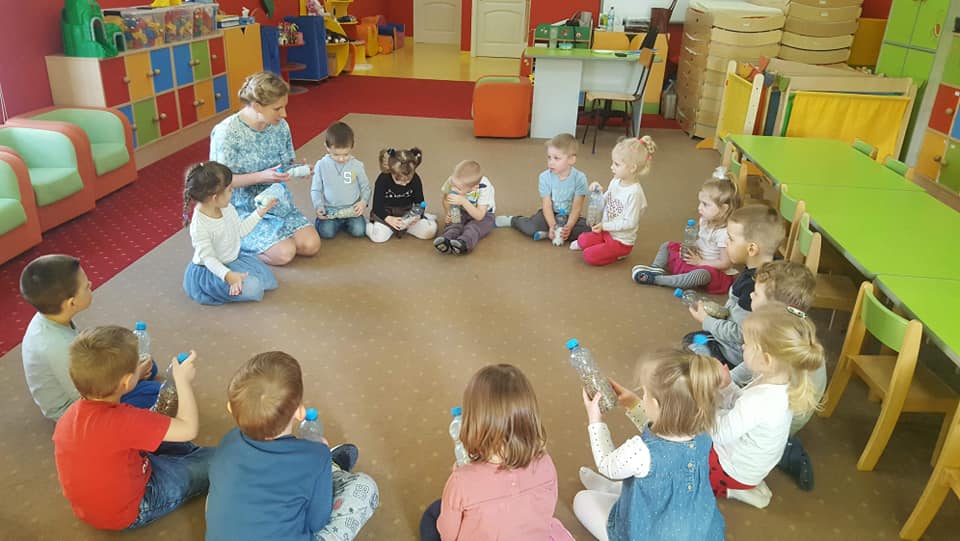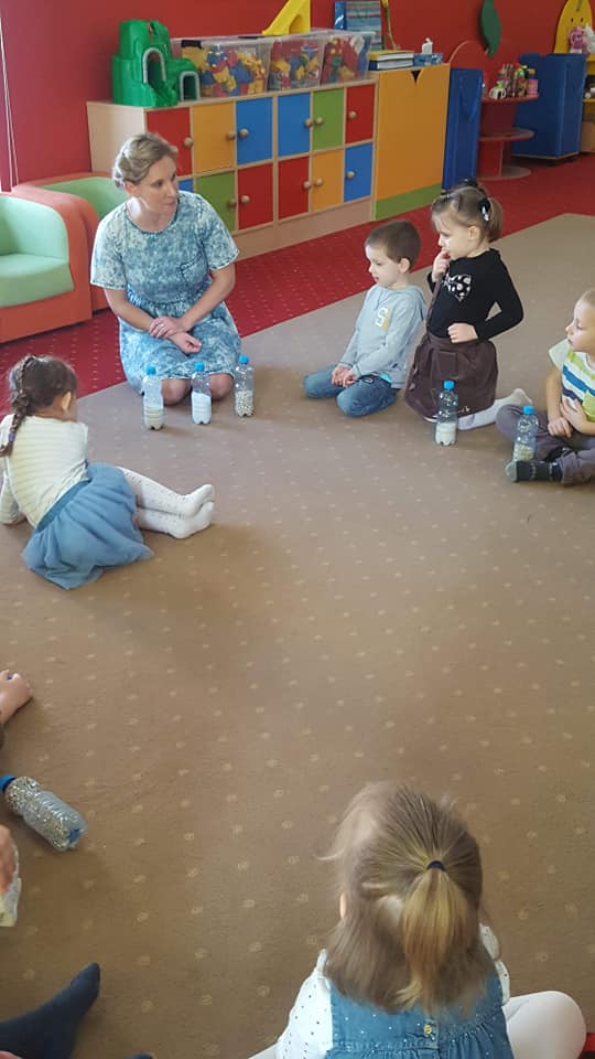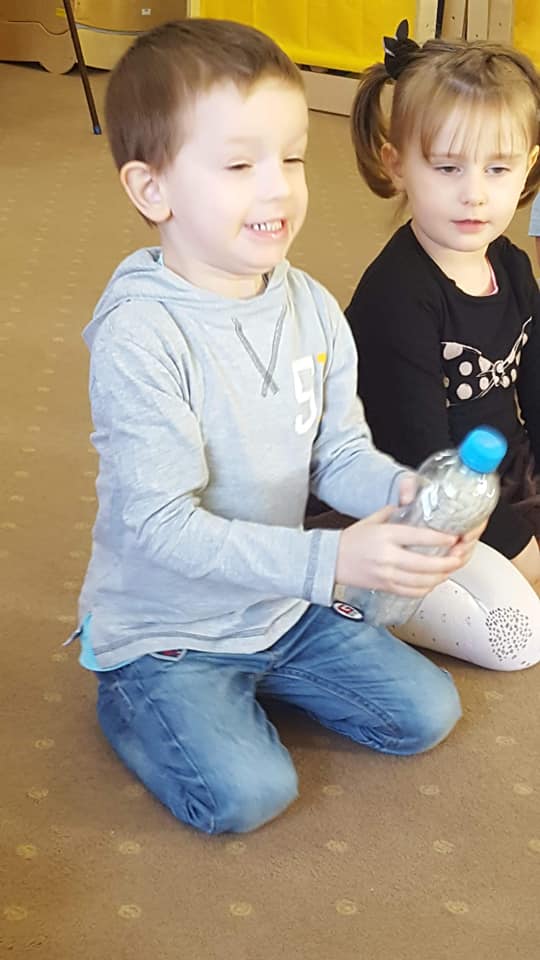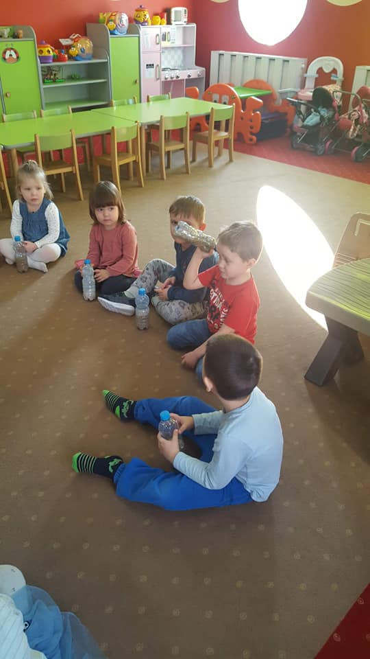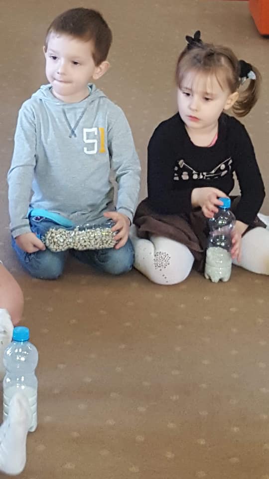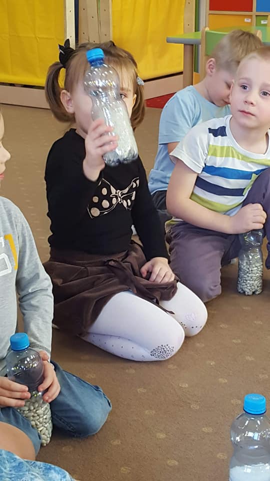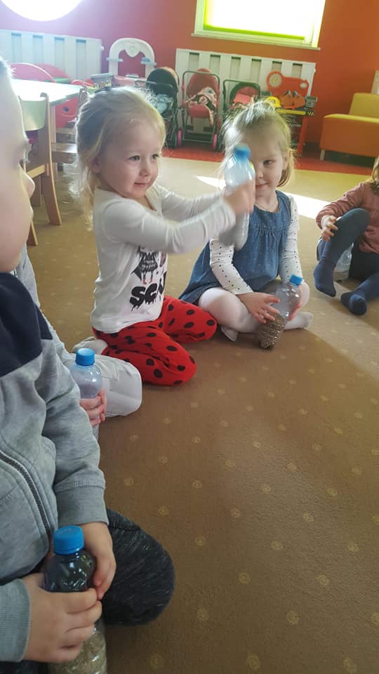Następnie grzechotki zostały wykorzystane do ćwiczenia spostrzegawczości słuchowej. Dzieci z zamkniętymi oczami odgadywały, którym produktem potrząsa ciocia. Na koniec każdy otrzymał grzechotkę i przez potrząsanie wydobywał z niej wskazany przez opiekunkę rytm. Zabawy i gwaru nie było końca!