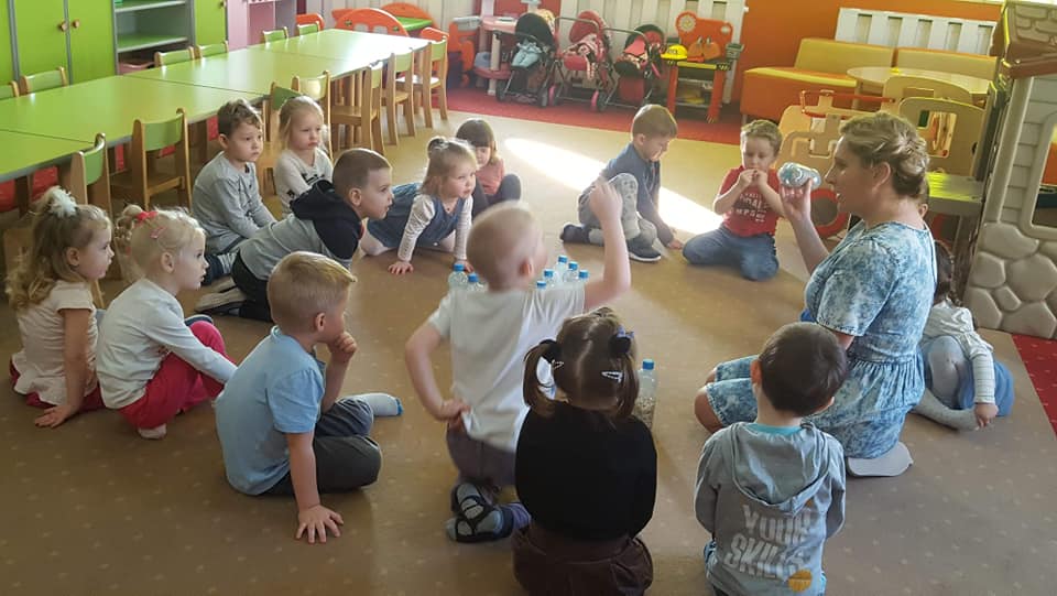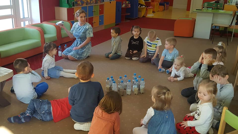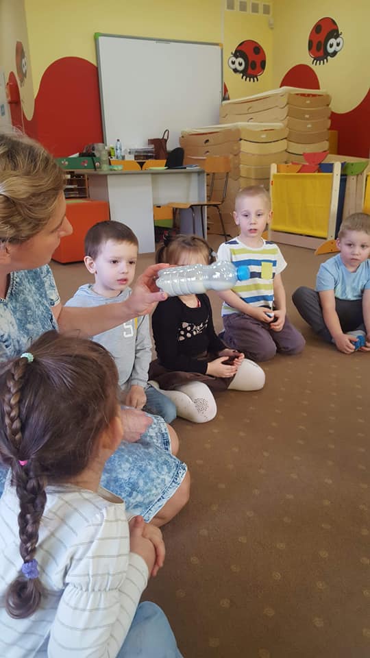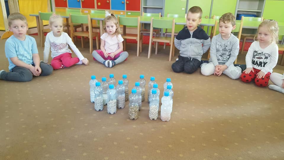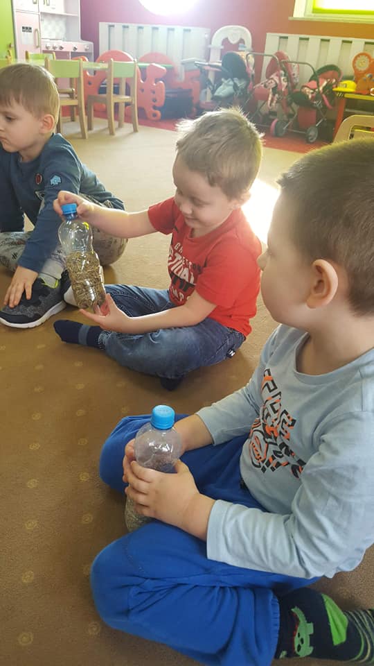 Na dzisiejszych zajęciach wykorzystaliśmy artykuły spożywcze w nieco inny sposób. Kasza, groch, fasola, cukier, sól i płatki owsiane posłużyły opiekunkom jako wypełnienie przeźroczystych butelek po wodzie. Każdy maluszek otrzymał swoją grzechotkę i jego zadaniem było odgadnięcie co jest w środku. Dzieciaki określały wielkość, kształt, a także dźwięk towarzyszący potrząsaniu. Żlobkowicze starali się też samodzielnie nazwać produkt.