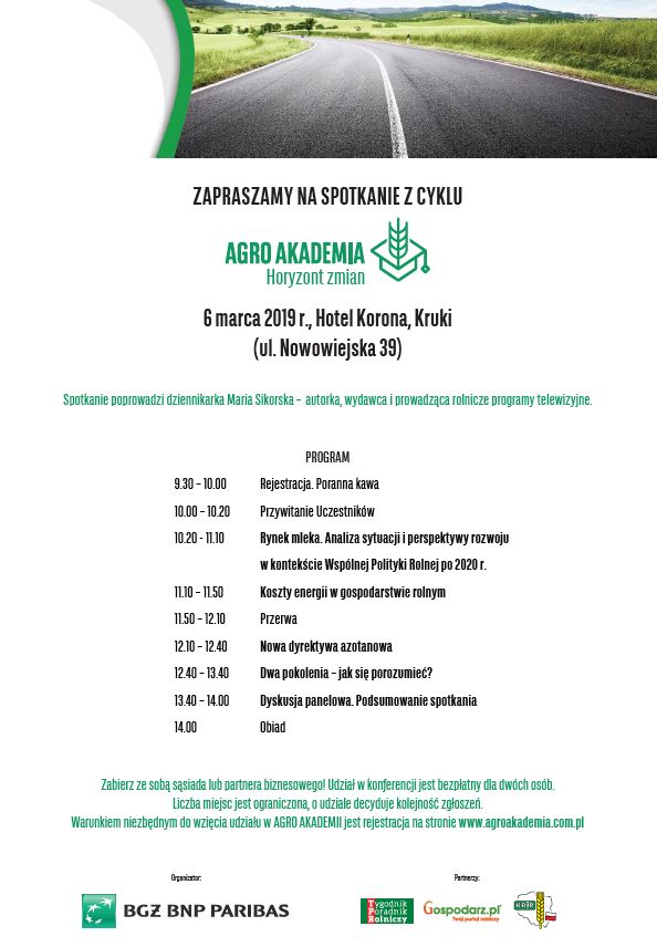 Zapraszamy na spotkanie z cyklu Agro Akademia Horyzont zmian, które odbędzie 6 marca 2019r., Hotel Korona, Kruki (ul. Nowowiejska 39).